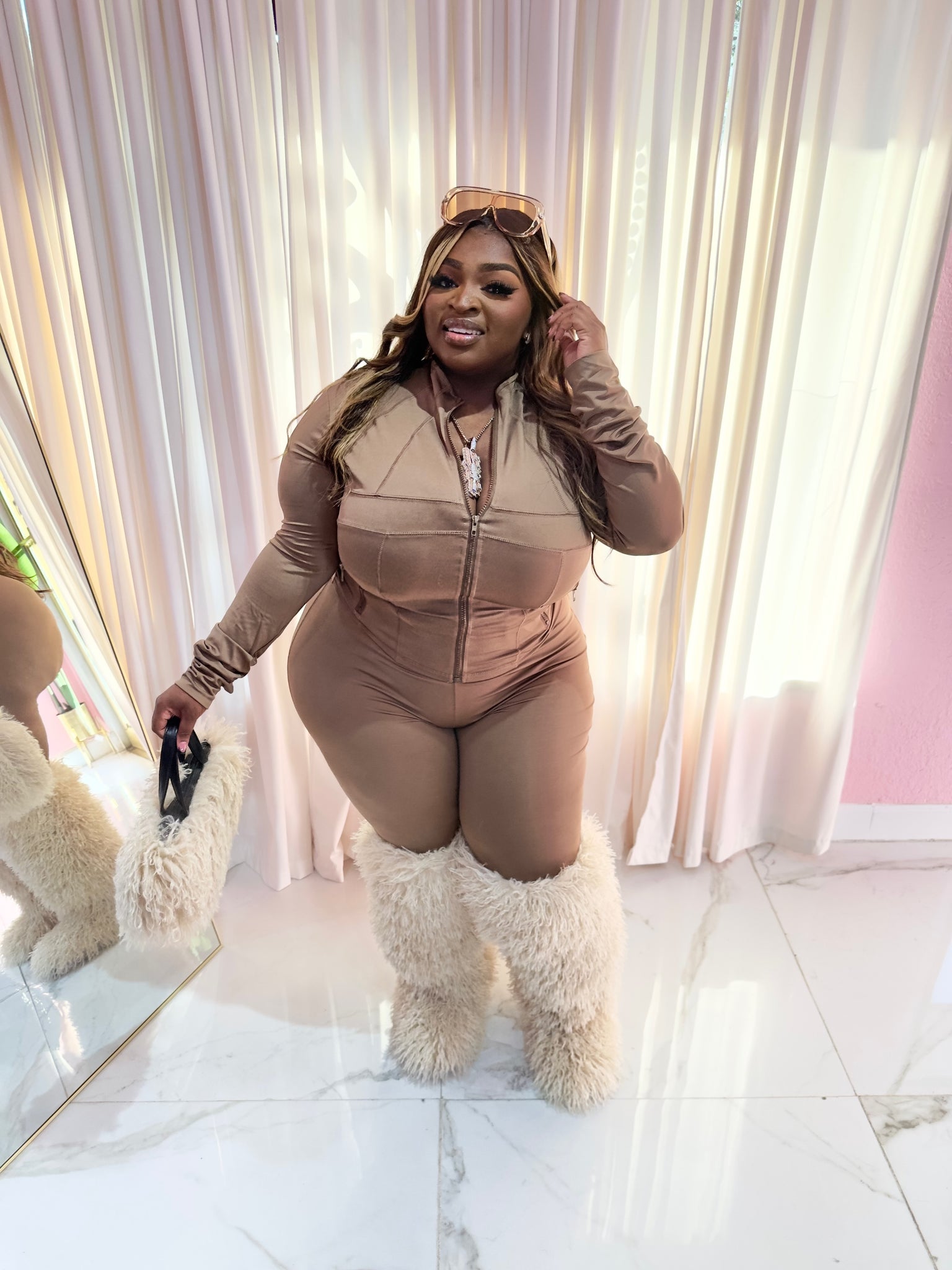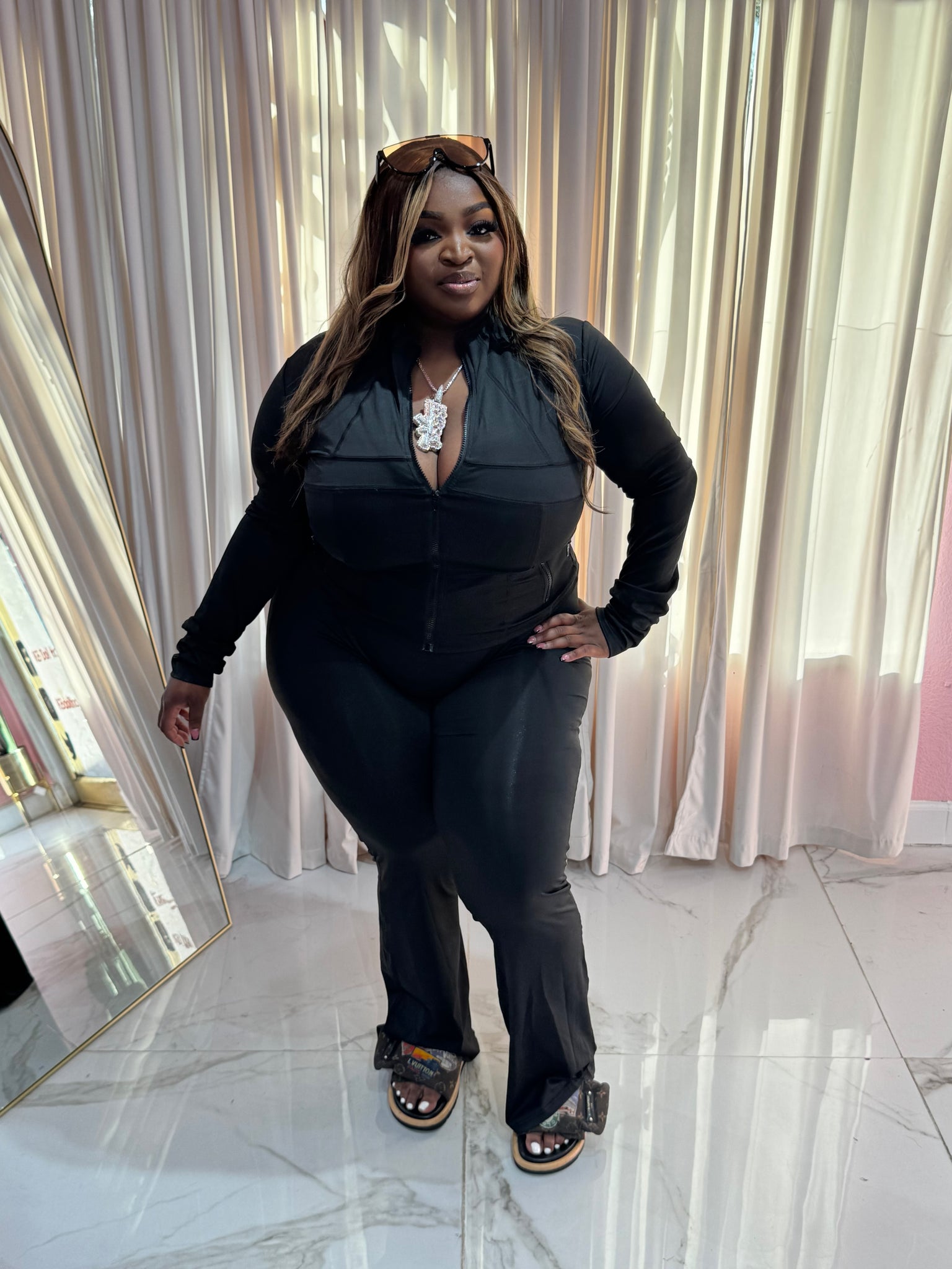 This is the one every doll needs in rotation. The KB Doll Essential Set is your go-to two-piece when you want to look put together with zero effort but still apply pressure. Featuring a fitted zip-up long sleeve top and matching high-waisted leggings, this set snatches the waist, smooths everything out, and hugs your curves just right.